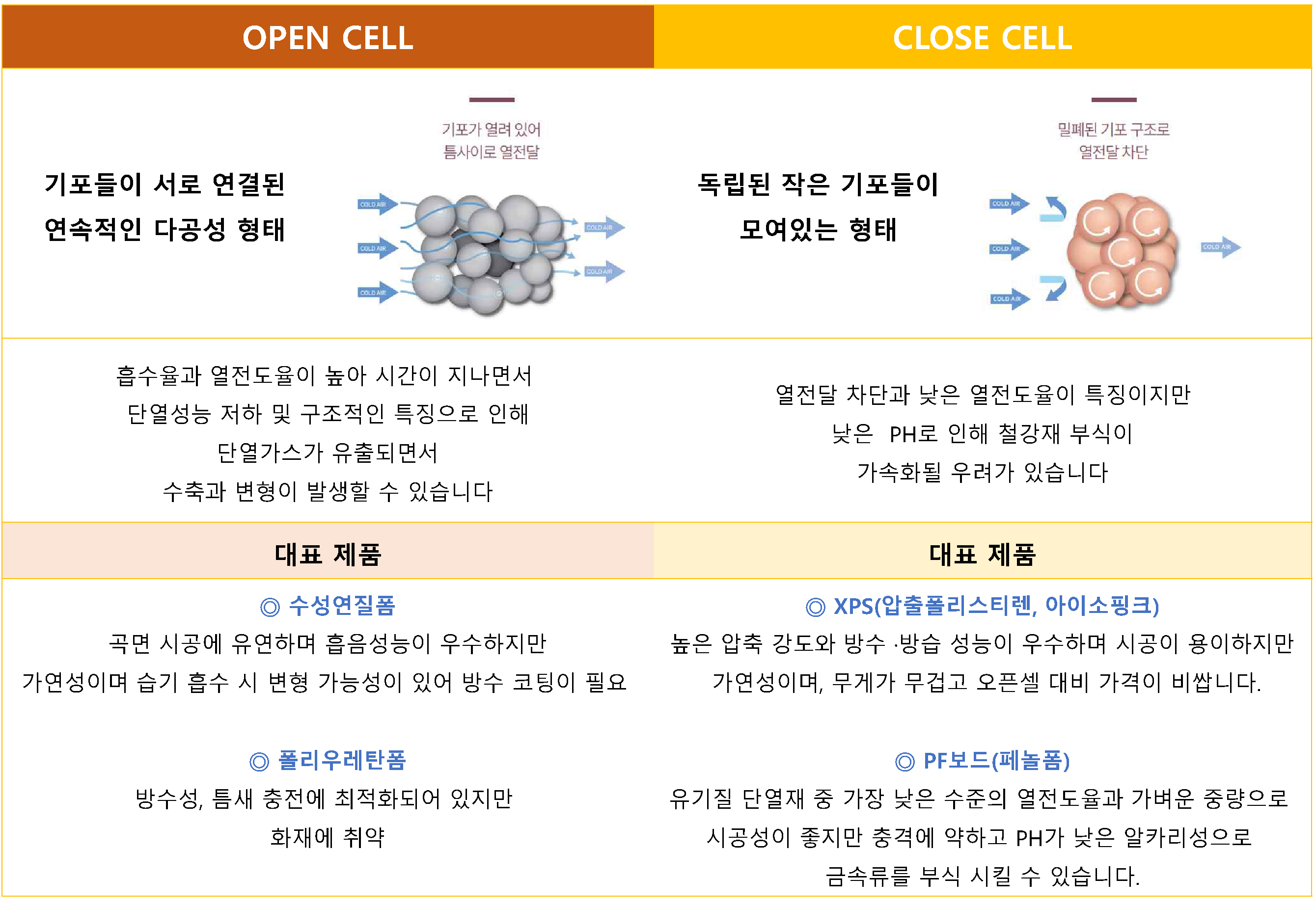 클로즈셀 구조는 불연성이며 습기에 강하지만 가격이 상대적으로 고가입니다.