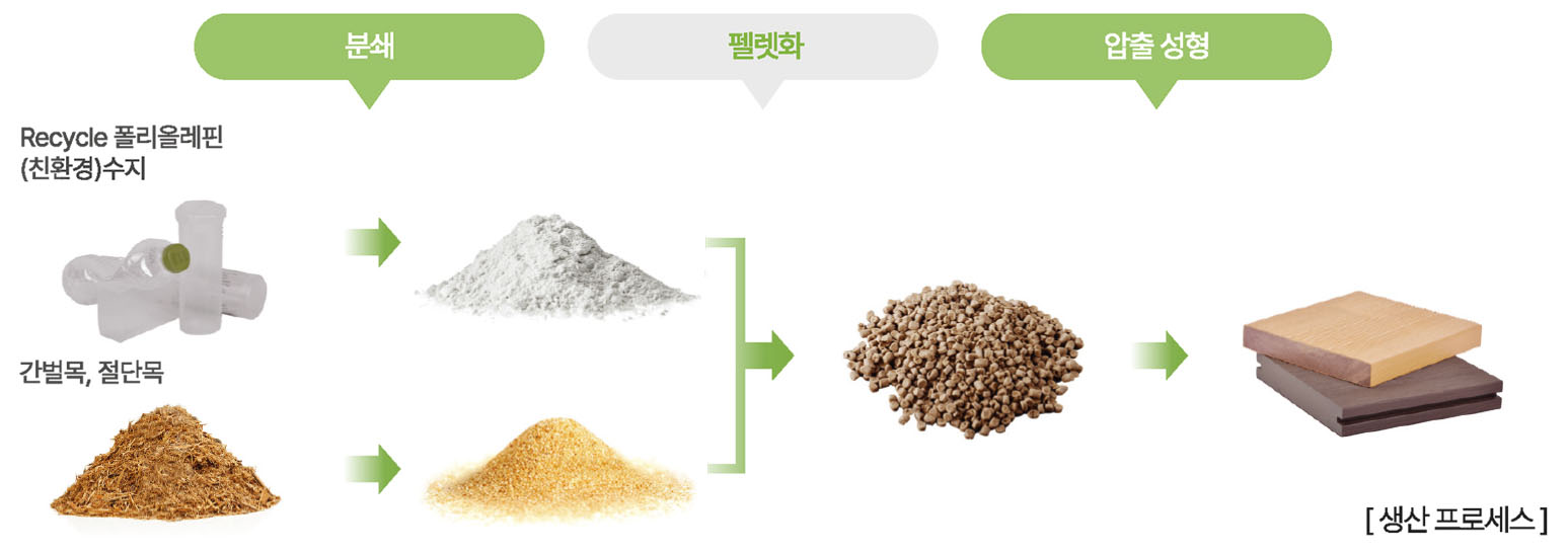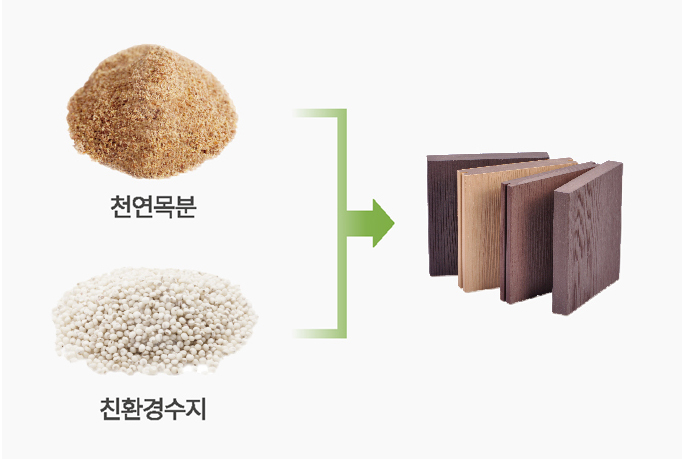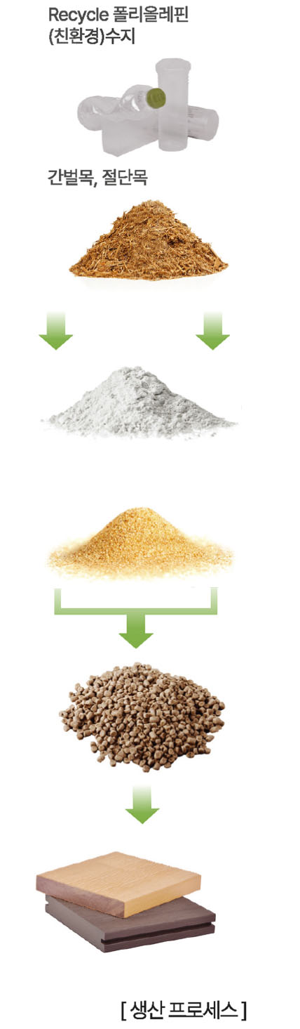 - 가구 생산과정에서 발생하는 톱밥, 나무 조각, 잘라낸 나무를 잘게 분쇄하여 만든 목칩(70%)과, 재활용된 친환경 플라스틱(30%)을 Wood Plastic Composite이라는 공정을 통해 나무보다 더 좋은 나무, 자연 절약에 도움이 되는 재생 가능한 새로운 건축 외장재로 만들어집니다.