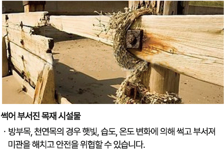 - 목재는 주기적으로 세척 및 오일스테인 처리를하여야 하며 변형, 갈라짐으로 인한 교체 비용이 지속적으로 발생합니다.